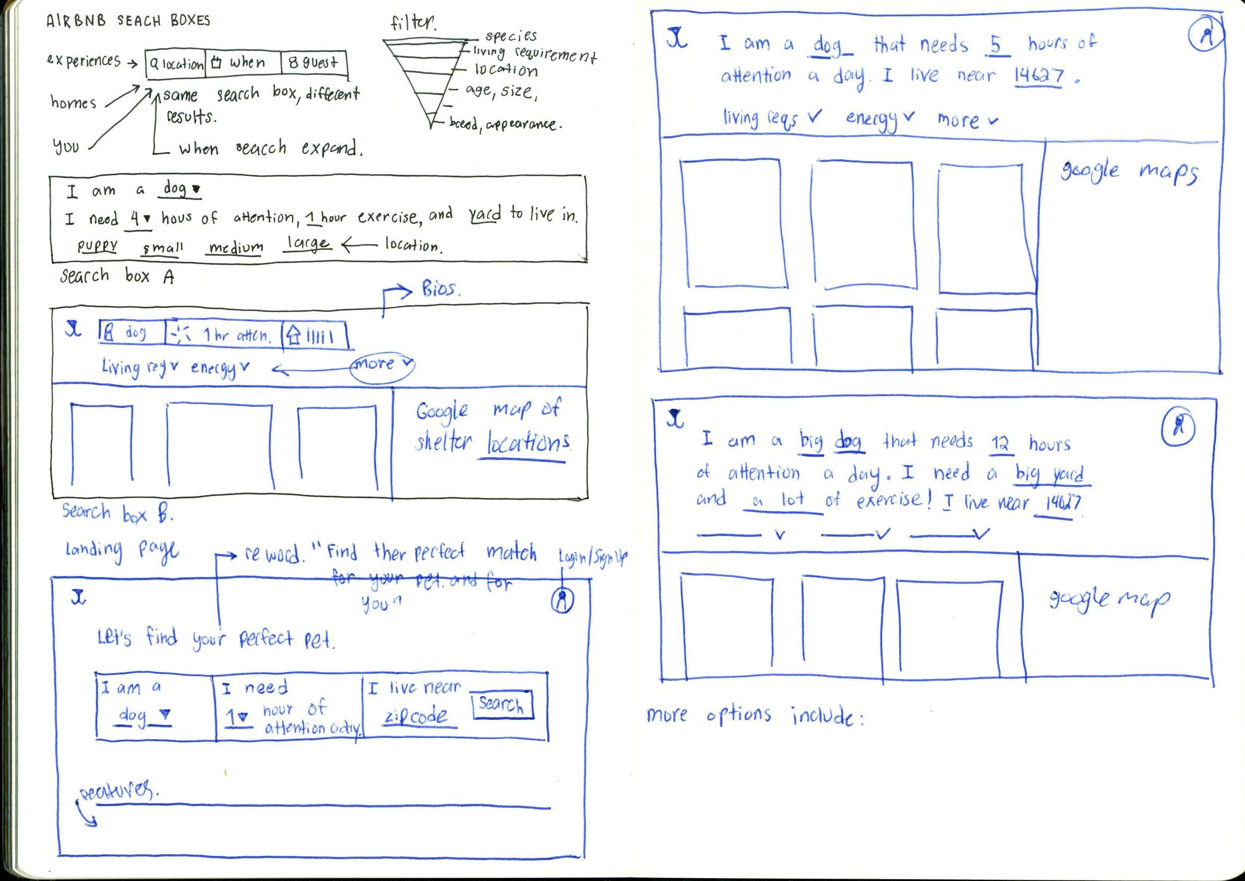 “I looked on AirBnB and Pinterest because they have a large set of picture data that users can filter through easily. I didn’t consider Instagram because it’s more meant to browse. I also looked at current pet adoption websites like Petfinder.”