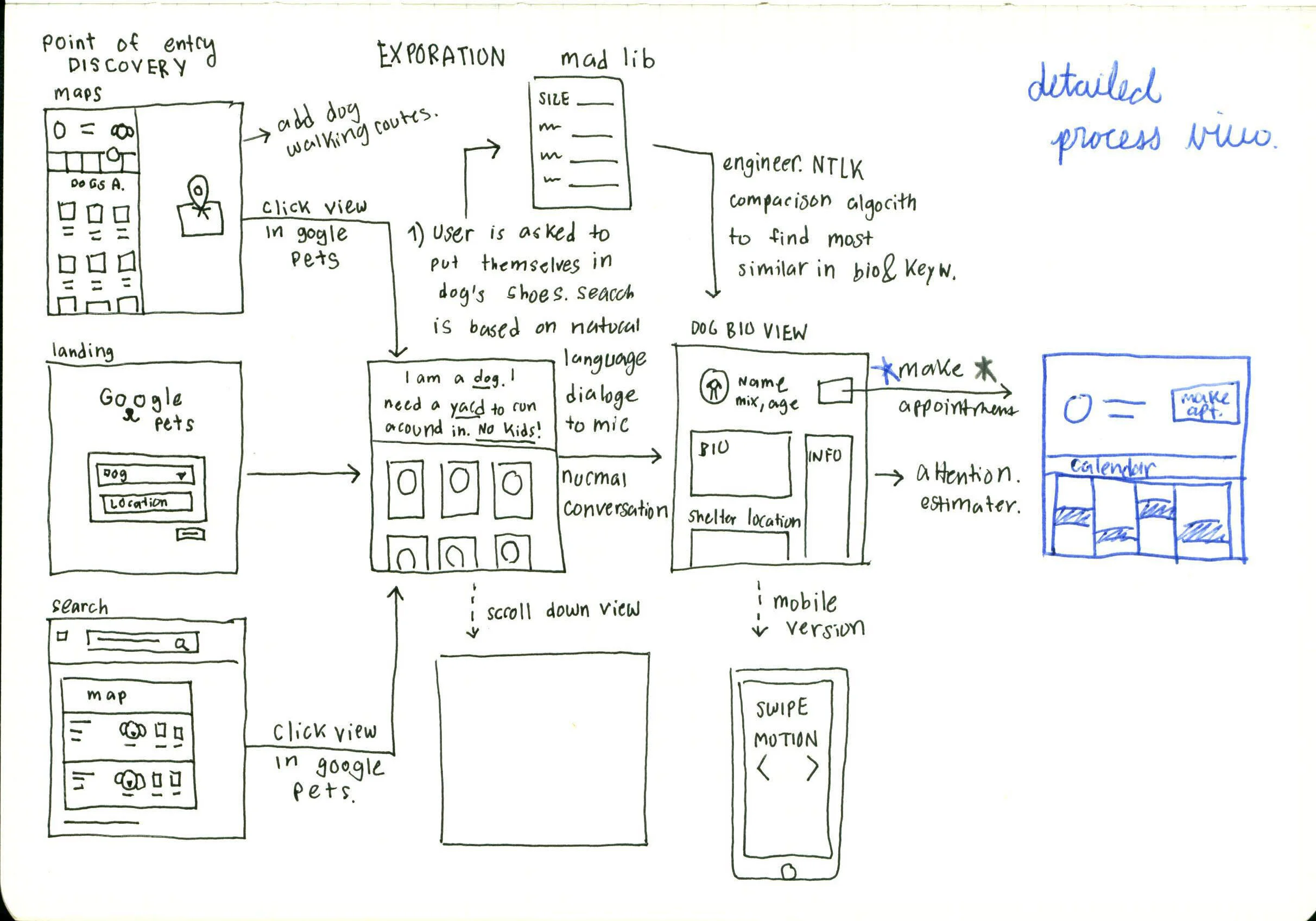 I did a competitive analysis of available apps and websites on pet adoption, conducted surveys via Google surveyed with potential adopters, and interviewed with animal shelter staff to formalize a process flow for pet adoption. I also walked around my neighborhood and did guerilla interviews with people about what they thought the dog adoption process should be like.